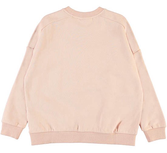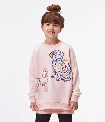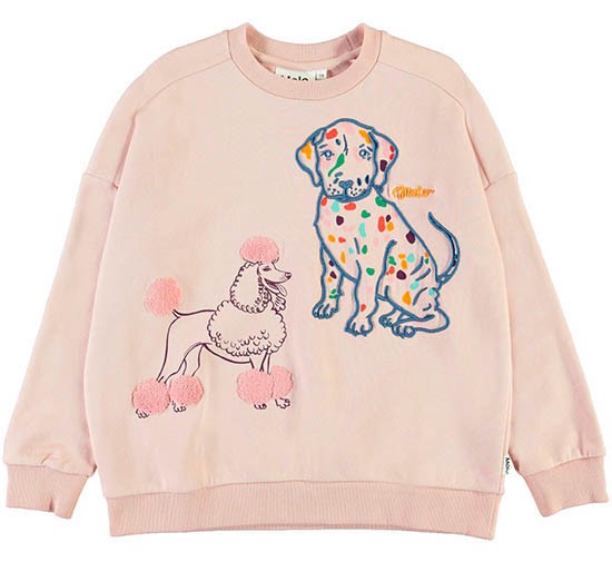 Lasten vaaleanpunainen väljä Molo collegepaita kauniilla koira-aiheisella applikoinnilla ja printillä.