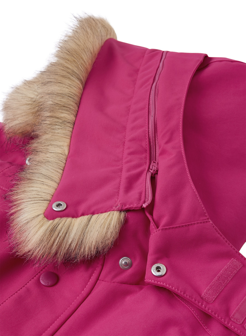 - Turvallinen, irrotettava ja säädettävä huppu, jossa irrotettava tekoturkissomiste