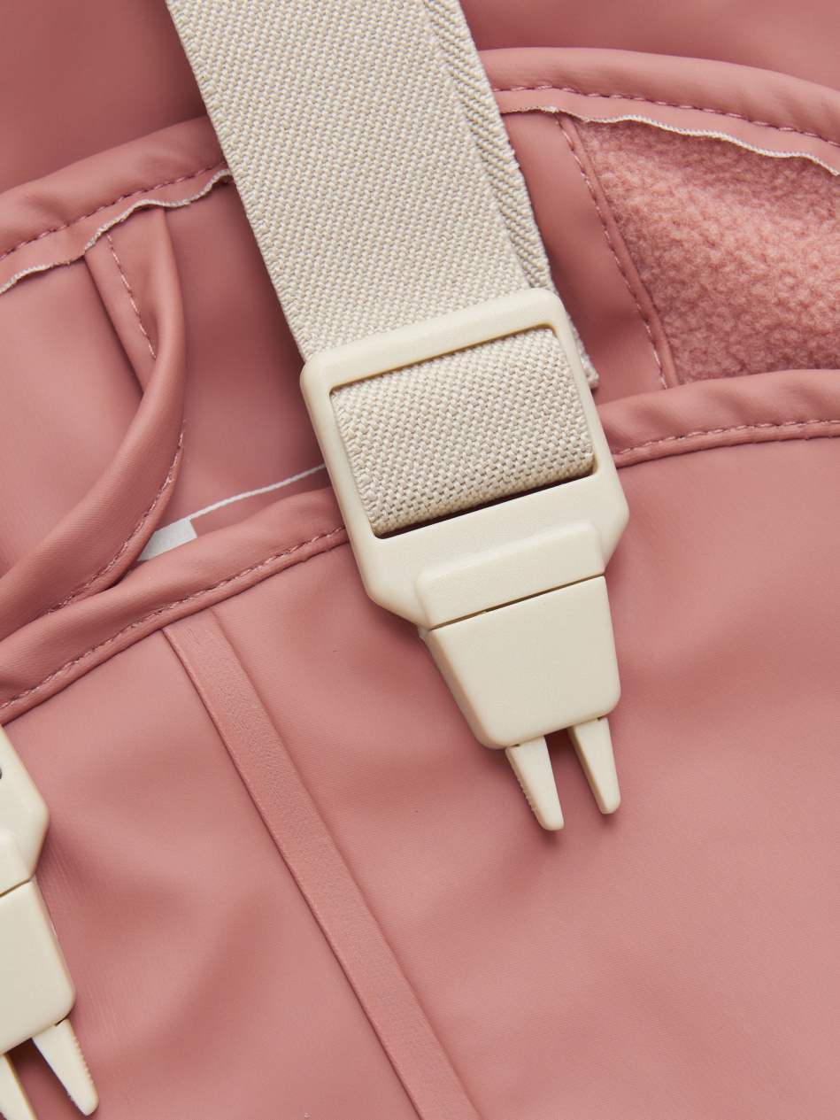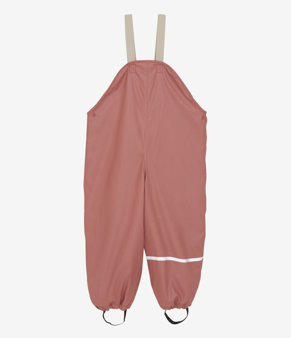 Rain pants made of recycled polyester with PU coating with fleece lining from CeLaVi. Made in durable material - partially recycled material. The rain pants are waterproof with a testet water column pressure of 10,000 mm. The rain pants have adjustable elastic suspenders with buckles in size 80-100. Snaps in each side to give the pants a good fit. Rain pants with elastic edge at the waist in size 110-130. Both pants have reflective details and adjustable elastic bootstraps at the ankles. Comfortable to wear with fleece inside. Practical name label for the childs name on the inside. Certified acc. to GRS - Made with 51% Recycled Material CERES-0366
