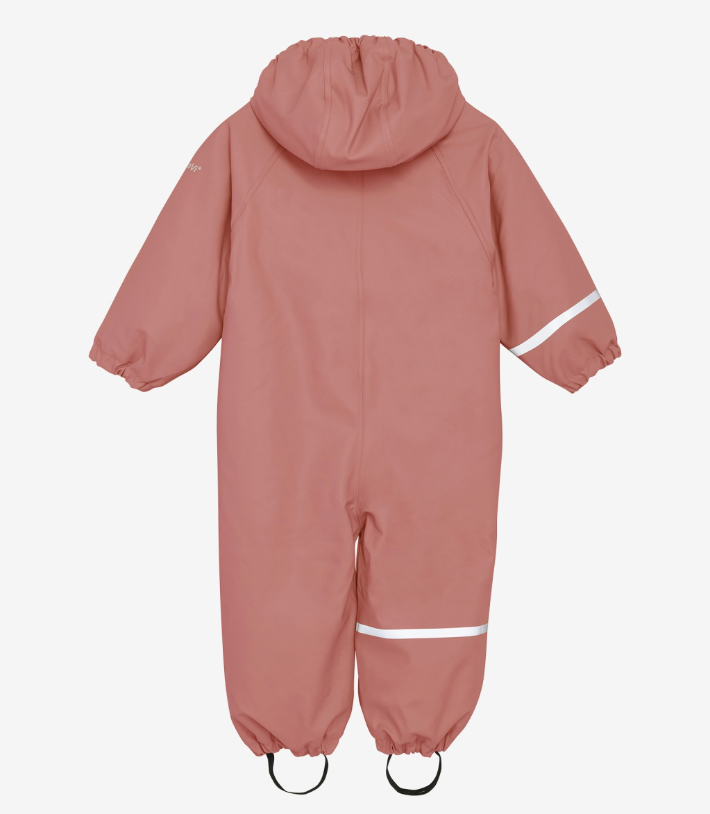 Rainsuit made of recycled polyester with PU coating with all-over print and fleece lining in durable material from CeLaVi. Tested water column pressure of 10,000 mm. The suit opens at the front with a quality zipper with chin protector and double windpole, on which the outer closes with practical snaps. The chin protector makes sure that the zipper feels soft under the chin. The suit has soft fleece lining and a detachable hood. Adjustable elastic foot straps that can be put under the boots so that it stays in place. Reflective details in several places on the suit. It has a name tag inside. Certified acc. to GRS - Made with 51% Recycled Material CERES-0366