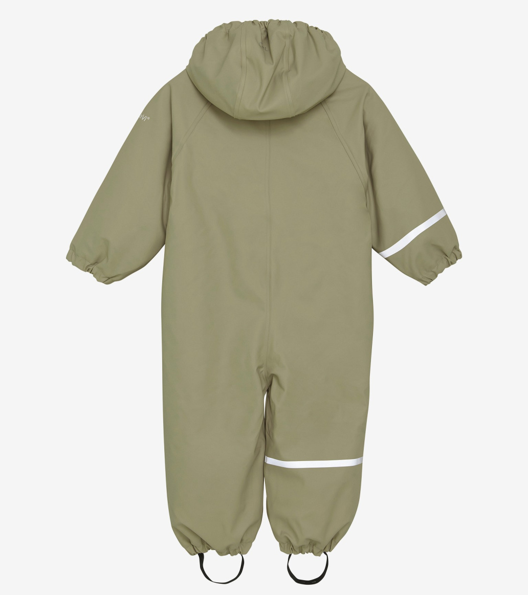 Rainsuit made of recycled polyester with PU coating with all-over print and fleece lining in durable material from CeLaVi. Tested water column pressure of 10,000 mm. The suit opens at the front with a quality zipper with chin protector and double windpole, on which the outer closes with practical snaps. The chin protector makes sure that the zipper feels soft under the chin. The suit has soft fleece lining and a detachable hood. Adjustable elastic foot straps that can be put under the boots so that it stays in place. Reflective details in several places on the suit. It has a name tag inside. Certified acc. to GRS - Made with 51% Recycled Material CERES-0366