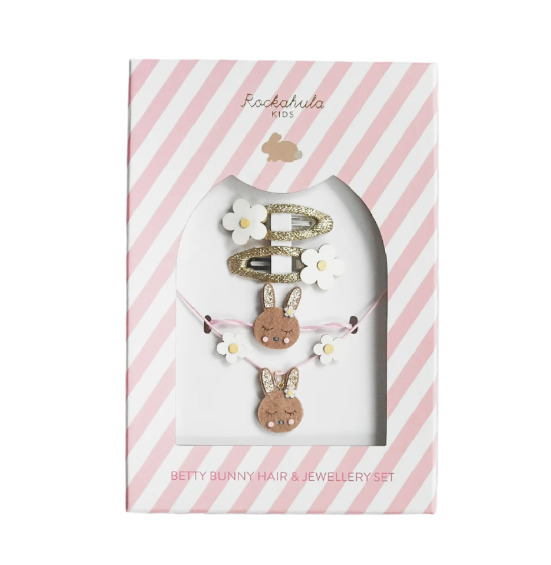 This lovely gift box makes the perfect Easter gift! The set includes two bright flowers on gold ribbon wrapped clips, and a necklace and bracelet our Betty Bunny with sweet pink cheeks and glittering ears. Each set is beautifully presented in a gift box that is the perfect size for letter box gifting!