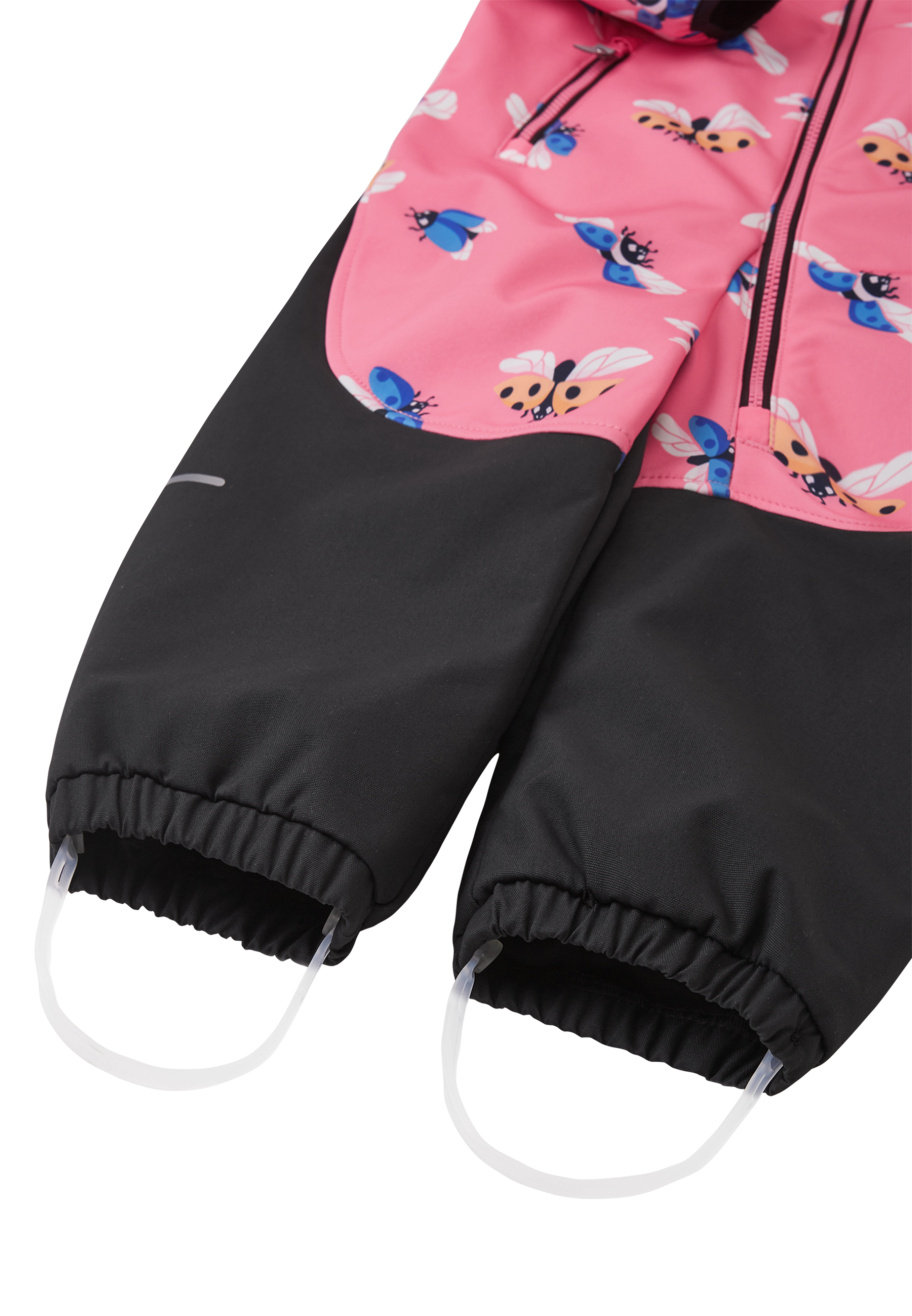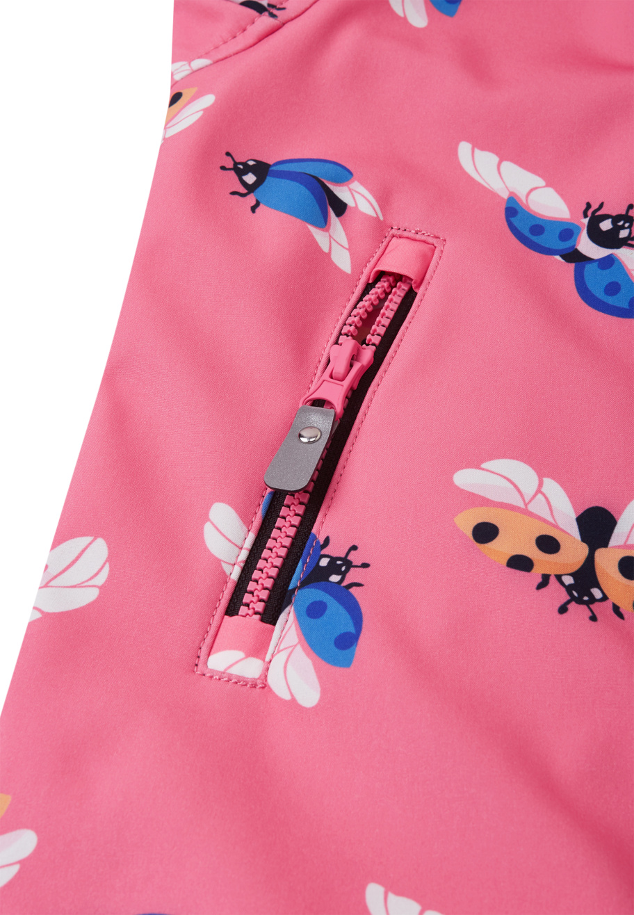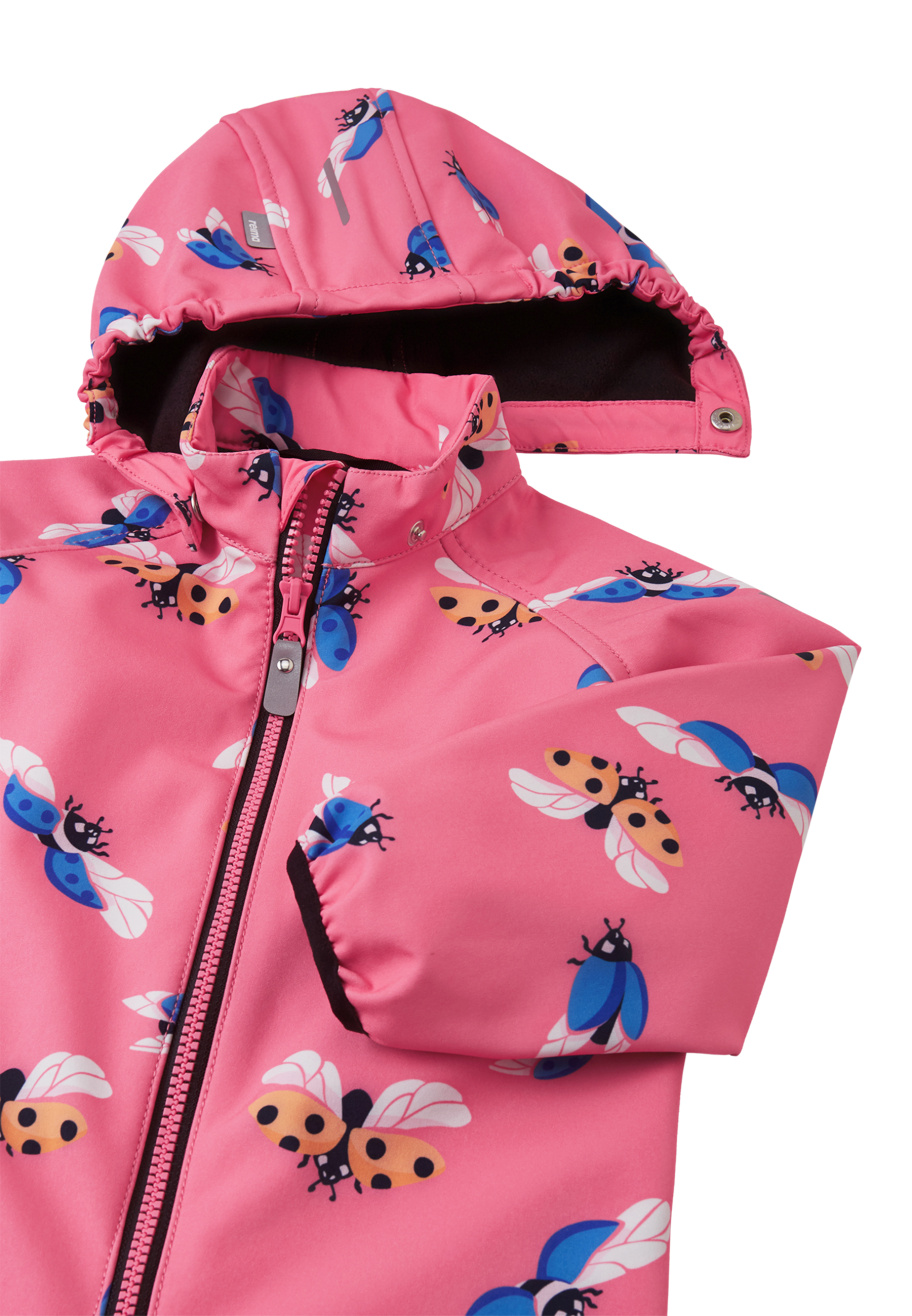 Pienten lasten tuulenpitävä Mjosa softshell-haalari on hengittävä ja hylkii tehokkaasti vettä. Reiman softshell on tekninen kolmikerrosmateriaali, jonka sisäpuoli on fleeceä. Irrotettava huppu suojaa viimalta ja on turvallinen leikkiessä. Täyspitkä vetoketju helpottaa pukemista, ja leukapehmuste estää vetoketjun lukkoa hankaamasta. Kestävä vahvike alaosassa.