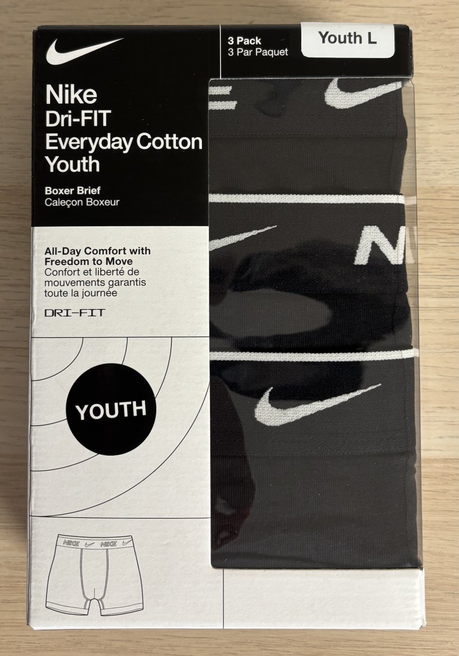 3 pack of boxer briefs. Nike Dri-FIT technology helps you stay dry and comfortable all day. Stretch material enhances your freedom of movement. Wide hems help keep underwear in place.