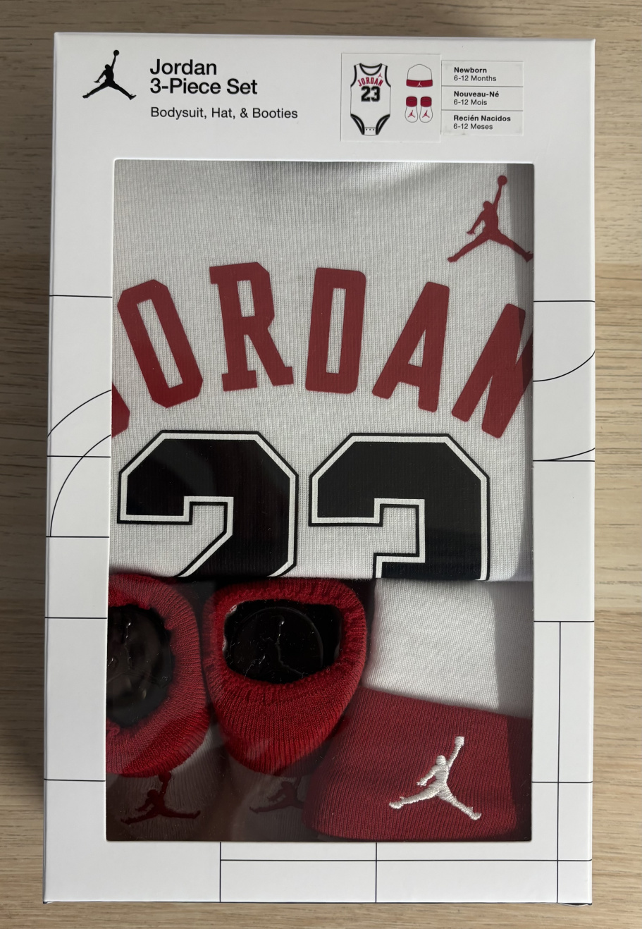Cute three-piece Jordan baby set in a gift box. Includes bodysuit, hat and booties.
